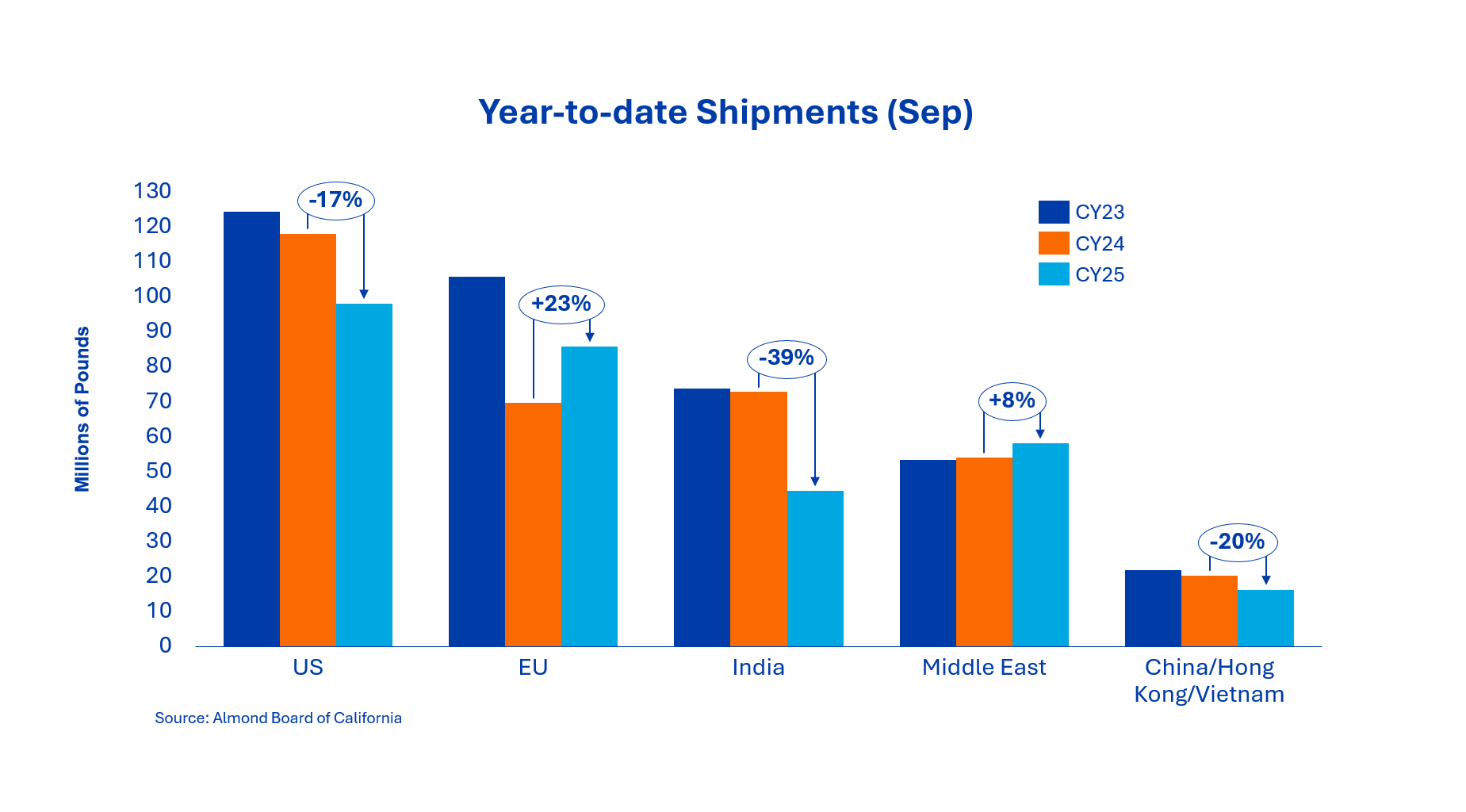 Die geringeren Erntemengen spiegeln niedrigere Erträge bei Nonpareil-Sorten und einen langsameren Durchsatz bei Schälbetrieben wider – verursacht durch höhere Feuchtigkeit und dickere Schalen.