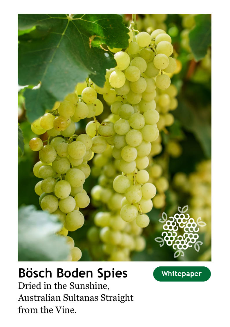 Die goldenen Trockenfrüchte aus Australien überzeugen durch erstklassige Beerenqualität und optimale Größe – ein Qualitätsmerkmal, das dank der innovativen „Drying on the Vine“ – Technik, bei der die Trauben direkt am Rebstock getrocknet werden, sichergestellt wird.